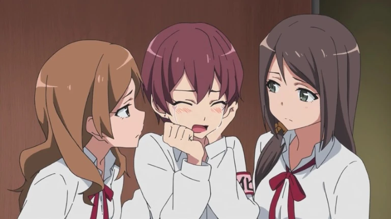 Hayato, Haruka, and Yukko attempting to comfort Minami into coming back to the school.
