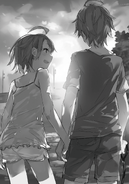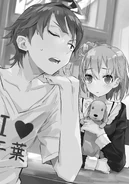 Hachiman and Kamakura are hiding from Sable. Komachi finds them and makes Hachiman go with her and Sable on a walk. Komachi mentions its been a while since they last went out together. She misses him when he is gone, like when he was in the hospital (the car accident before high school). Hachiman says she has to get used to that because eventually he'll be gone. Komachi looks sad, he then mentions that he intends to stay at home as long as possible, even through university. He mentions its not because he is a leech, but because he will miss Komachi, which cheers her up. Komachi suddenly brings up Yukino, mentioning Yukino lives alone and is probably lonely. Hachiman agrees and then reminds Komachi that he will probably stay home until he meets his dream wife and can become a house-husband.[1]