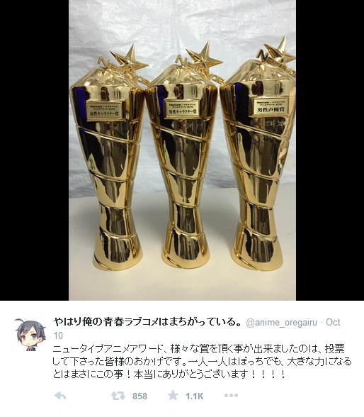October 10th, OreGairu won three NewType awards at the MACHI☆ASOBI in Japan.